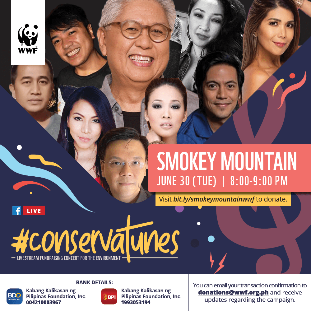 On June 30, 2020, World Wild Fund for Nature (WWF) Philippines is set to embark on another leg series of #Conservatunes with various music artists like National Artist for Music Ryan Cayabyab and the iconic 90’s OPM group Smokey Mountain reuniting with its original members – Tony Lambino, Shar Santos, Chedi Vergara, Jeffrey Hidalgo, Jason Angangan, James Coronel, Geneva Cruz, and Anna Fegi.
