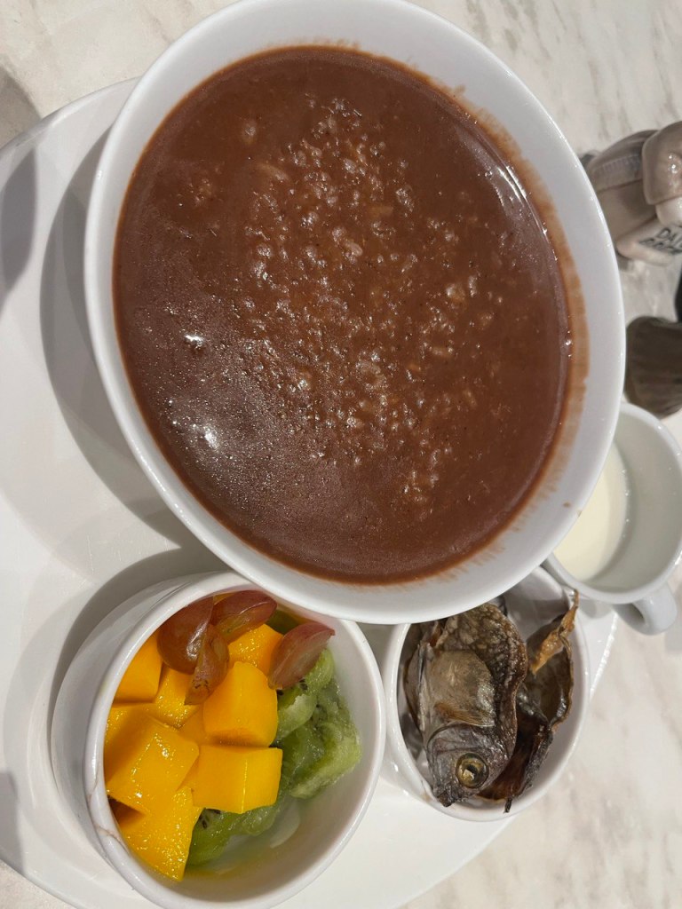 They serve all-day breakfast, too! Their Champorado is perfect for the rainy season. It is not too sweet and even served with the best fried danggit I ever tasted in the most recent times. It also has the perfect balance of mixed fruits–in the photo: ripe mangoes, grapes, and kiwi.