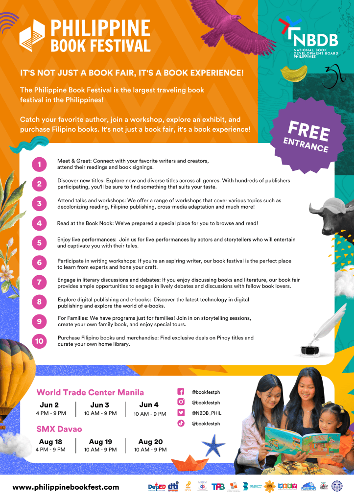 You can purchase from thousands of books and through more than 140 publishers! The Philippine Book Festival (PBF) is the perfect opportunity to discover new titles and authors, meet and greet with renowned writers and illustrators, and participate with friends, family, and colleagues. Admission to the event is FREE!